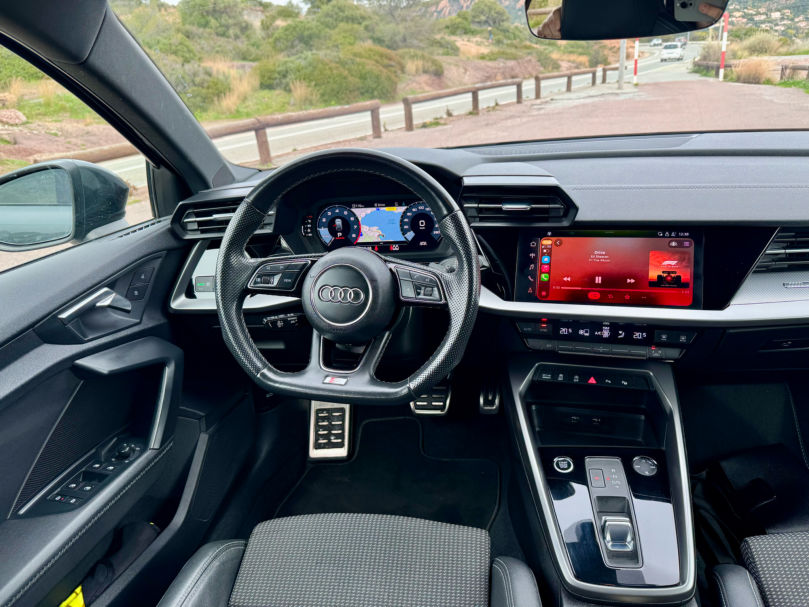 Véritable référence sur le segment des berlines compactes premium, cette Audi A3 séduit par son design affirmé, sa qualité de fabrication irréprochable et son expérience de conduite remarquable. La finition S line sublime son caractère dynamique avec des éléments esthétiques exclusifs et un intérieur à l’ambiance résolument sportive et élégante.